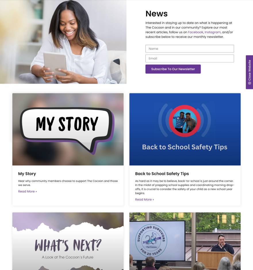 We designed The Cocoon’s website to meet the needs of its users. The site features an accessibility widget to accommodate for different auditory and visual needs, and a Close Website button to hide the page in case of a situation where the person’s screen needs to be quickly changed. The organization’s phone number is prominently displayed in the top right corner of every page so visitors can access help from anywhere on the site.