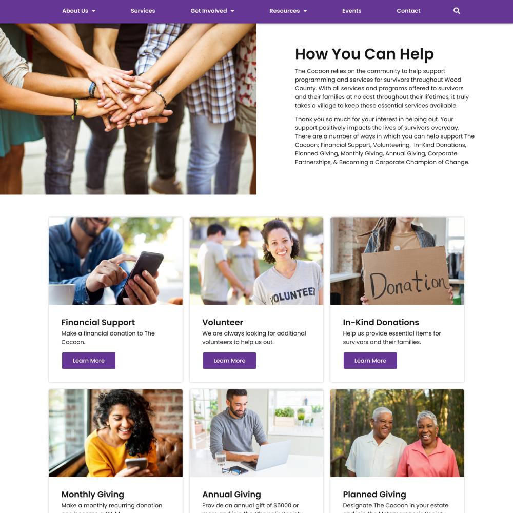 Through the Financial Support page, potential donors can read and select between several different ways that they can donate to The Cocoon. Easy-to-access buttons link right to the donation form, so donors can make a direct impact right away.